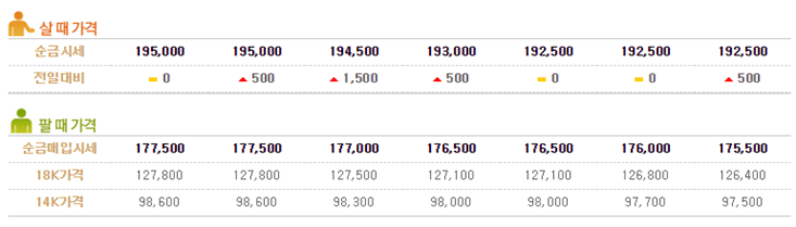 한국금거래 시세표를 살펴보면 기준 중량 3.75g 금 1돈 24k 순금시세 살때가격은 195,000원 입니다. 팔때 가격은 순금매입시세는 177,500원, 금 18k 시세는 127,800원, 금 14k 시세는 98,600원으로 나타났습니다.