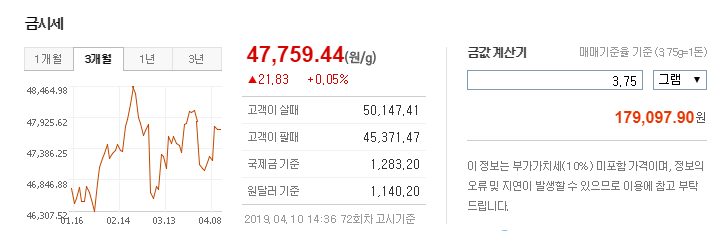 4월 10일 오후 2시 36분 72회차 한국금거래소와 신한은행 고시기준에 따르면 오늘 국내 금시세는 1g당 47,759.44원으로 나타났습니다. 이는 전날보다 21.83원 상승한 가격인데요.